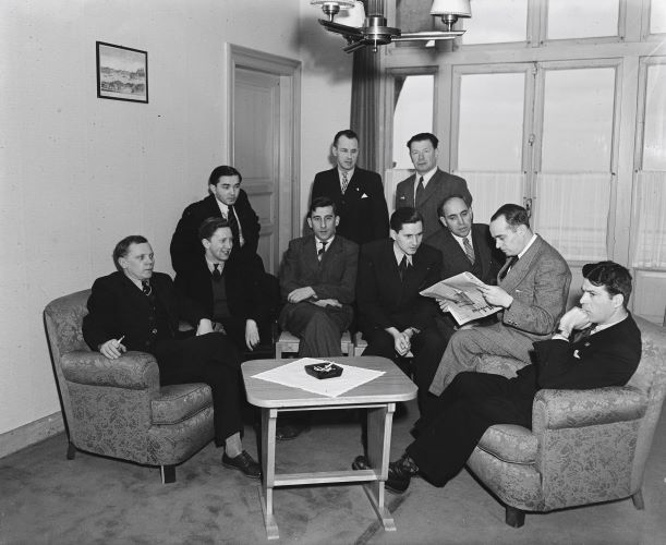 Some of the Russian delegation reading on the frontpage(!) of @volkskrantthat they had arrived in the Netherlands for the worldchampionship #chess 1948. Not so secret seconds were Kotov, Bondarevsky, Flohr, Lilienthal as well as officially Alatortsev, Ragozin & Tolush
