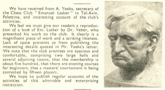 «Этот бюст Эмануэля Ласкера находится в шахматном клубе Ласкера в Тель-Авиве последние 50 лет или около того. Три таблички на основании гласили (слева направо): «П. (или Ф.) Н. Вебер» (предположительно скульптор); «Доктор Эмануил Ласкер»; «Подарок от президента клуба, мистера Элиезера Рабиновича».