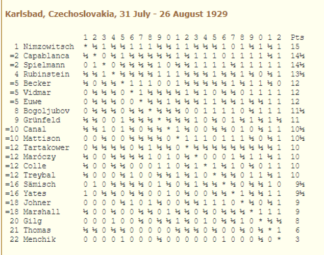 The event was won by Nimzowitsch; Capablanca & Spielmann shared 2nd-3rd place.