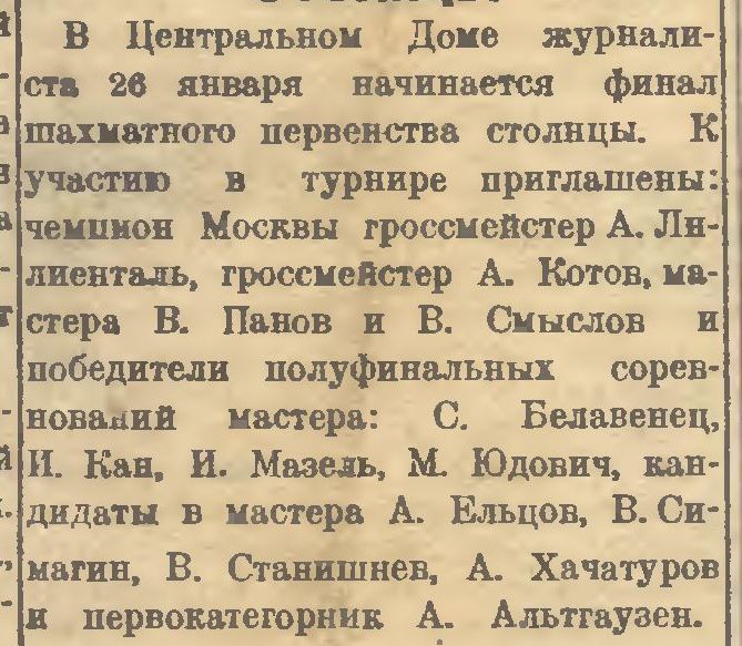 В следующем номере «64» от 22 января появилось сообщение о предстоящем чемпионате Москвы. В нем Лилиенталь назван гроссмейстером, но чемпионом не СССР, а Москвы (предыдущий чемпионат проходил на рубеже 1939-40 гг.) Впрочем, в новом чемпионате Москвы Лилиенталь играть отказался, за что был подвергнут общественному порицанию.