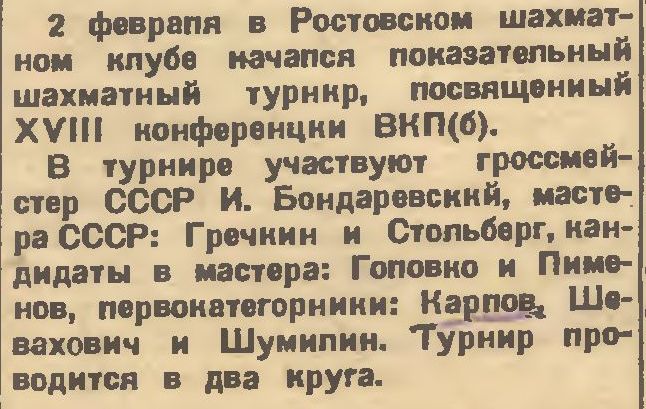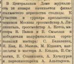 Сложнее с чемпионатом СССР 1927 г. Мне сейчас не хочется поднимать материалы из журнала Грекова, но вся эта перипетия с несыгранным матчем освещена в 1-м томе книги Воронкова, посвященной Богатырчуку, на с. 243-247. Суть в том, что между победителями должен был состояться матч, победитель которого становился чемпионом СССР и получал звание гроссмейстера (первого после уехавших Алехина и Боголюбова). Но оба участника тянули одеяло на себя и дождались, что гроссмейстером стал победитель чемпионата СССР 1929 г. глухонемой Верлинский. Впрочем, с него вскоре это звание сняли под каким-то благовидным предлогом.