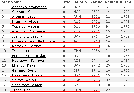 А вообще что бы не говорили, плотный турнир. Если Крамнику и Ароняну +1 достаточно, чтобы не потерять рейтинг. Кстати, новый рейтинг сильнее радует глаз: наверху Ананд, Топалов позади ВБ и самое главное - трое россиян в десятке и далее: