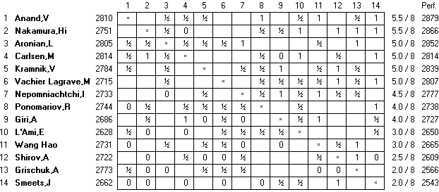 Накамура и Ананд +3, Аронян, Карлсен, Крамник и Вашье-Лаграв +2. Плотно идут, интересно.