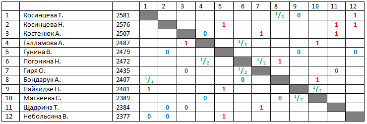 | Результаты 3 тура: Костенюк - Галлямова 0-1, Шадрина - Гиря 1-0, Матвеева - Паикидзе ничья, Погонина - Боднарук 1-0, Гунина - Косинцева Н. 0-1, Косинцева Т. - Небольсина 1-0 | http://russiachess.org/ |