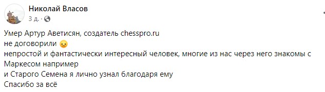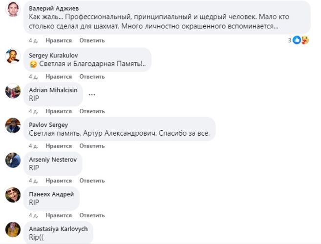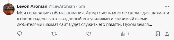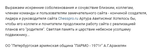 только что узнал(( несмотря на... артуру, пусть запоздалая, но огромная благодарность за труд, площадку, возможность познакомиться и пообщаться с таким интересным сообществом. он создал и поддерживал, как мог, этот многоплановый шахматный, спортивный, творческий и интеллектуальный оазис, где находили отдушину многие незаурядные интернет-путники, глубокие и яркие личности, разномастные профессионалы. и даже если иногда его подход к контенту, стиль модераторства вызывал вопросы и недовольство - направлен он был всегда на одну благородную цель - сохранения ресурса и его дружеского микроклимата в чистоте. сделать это безукоризненно в наше турбулентное политизированное время очень сложно, требовались силы, нервы и, как следствие, не всегда популярные решения. но результат был, ресурс жил, и заслуги артура в этом переоценить невозможно.