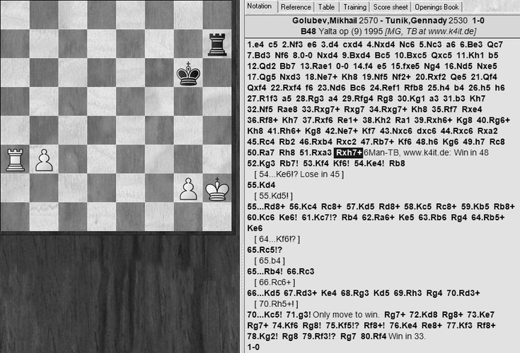 Иногда компьютер помогает немного улучшить, скрасить впечатление о вашей игре. В партии 1995 года с Геннадием Туником, когда было уже выиграно, допустил неточность, произошел переход в эндшпиль с ладьей, двумя пешками против ладьи в такой редакции, что уже не был на 100 процентов уверен, что объективно выигрыш. Недавно посмотрел на www.k4it.de - все-таки ничьей нет в этой позиции. (Хотя редко, конечно, на каком ходу находил кратчайший путь. Даже отмечать все кратчайшие пути нет особого смысла, столько их там).