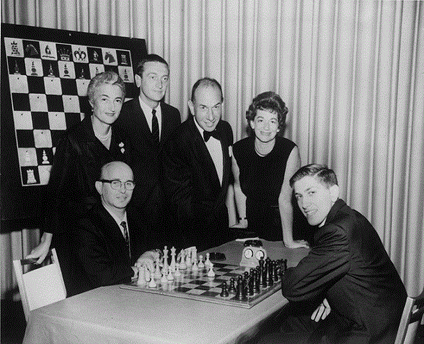 Samuel Reshevsky, Jacqueline Piatigorsky, unknown, Jose Ferrer, Lina Grumette, and Bobby Fischer at the Outset of the 1961 Fischer—Reshevsky Match