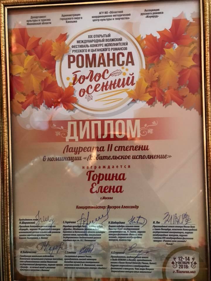 Дочка (которая поет) ездила в Кинешму (Ивановская обл.); принимала участие в международном, тематическом конкурсе вокалистов. В своей категории - "любители".