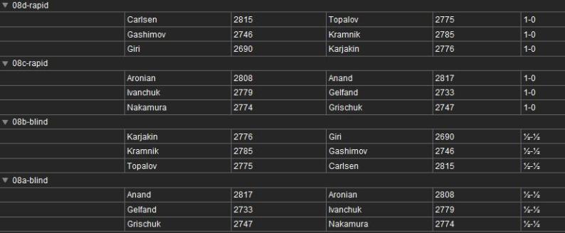 Даже я,не совсем адекватный болельщик Иванчука, не ожидал такого после столь провального старта.Обычно,если у Васи на старте масть не шла,то не шла она до самого финиша.Здесь же совсем другое дело!Браво!Ну и Левон,конечно,просто молодца! |