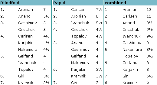 | Неофициальный Rp у "слепого" Ароняна вырос до 2985, у "рапидного" Карлсена - до 3045. |