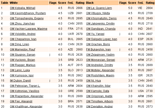 Положение после 6 туров. 1. Ле Куанг Льем (Вьетнам) – 5; 2-6. Д.Хисматуллин, М.Кобалия, Е.Томашевский, Н.Витюгов (все – Россия), Р.Касымжанов (Узбекистан) – по 4,5;