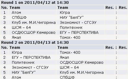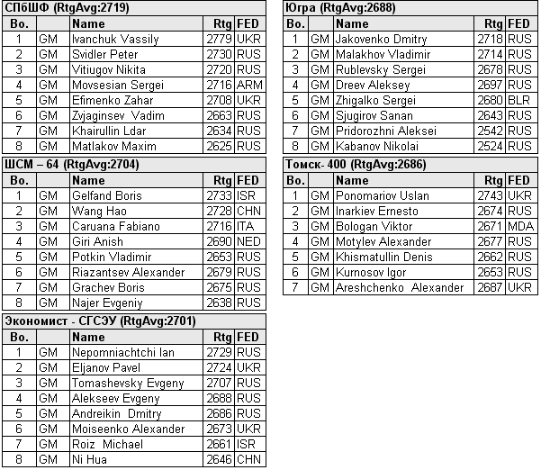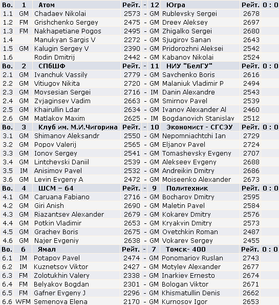 По крайней мере одна накладка точно есть: в матче АТОМ-Югра на пятой доске заявлено, что белыми играет Придорожный, а черными Калугин - хотя вроде бы должно быть наоборот. Но это я так, придираюсь |