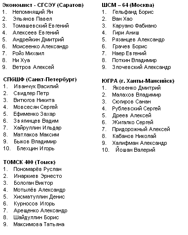 В XVIII мужском командном Чемпионате России главными претендентами на победу являются Экономист - СГСЭУ (Саратов),СПбШФ (Санкт-Петербург), ТОМСК 400 (Томск),ШСМ – 64 (Москва),ЮГРА (г. Ханты-Мансийск).