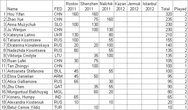 Утешение , что и остальные шахматистки Екатерина Лагно (Украина, 2554), Антуанета Стефанова (Болгария, 2528), Виктория Чмилите (Литва, 2525), Чжу Чень (Катар, 2490), Бат Монгонтуул (Монголия, 2465) набрали и от того еще меньше - малоутешительно.