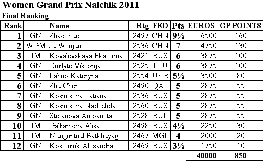 Итоги. 1. Чжао Сюэ – 9,5; 2. Цзюй Вэньцзюнь – 7; 3-4. Ковалевская, Чмилите – по 6; 5. Лагно – 5,5; 6-9. Чжу Чень, Т.Косинцева, Н.Косинцева, Стефанова – по 5; 10. Галлямова – 4,5; 11. Монгонтуул – 4; 12. Костенюк – 3,5.