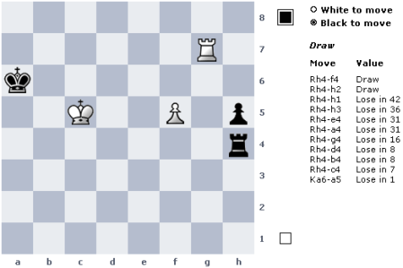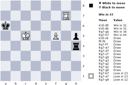| Выигрыша не находится. Чёрных спасает их проходная, которую необходимо дотолкать до h2: 41... Rf4 42.Rg5 h4 43.Kd6 h3 44.Rh5 h2 45.Ke6 Rf2 46.f6 , и теперь чёрные в полной безопасности: 46... Re2 47.Kd7 Rd2 48.Ke8 Re2 49.Kf8 Rf2 50.f7 Re2 51.Kg7 Rg2 52.Kh7 Rf2 Увы, никакие "мостики" здесь не строятся, поскольку ладья вынуждена стеречь пешку h2. |