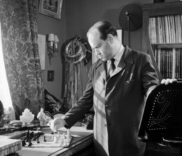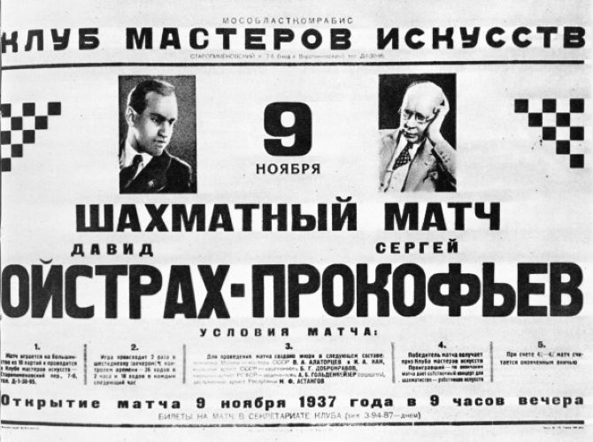 Знаменитый скрипач Давид Ойстрах (род. 1908, Одесса; ум. Амстердам, 1974) на фото у себя дома в Москве в 1958 году. Как и Прокофьев, он был увлечённым любителем шахмат; в 1937 году они сыграли партию.