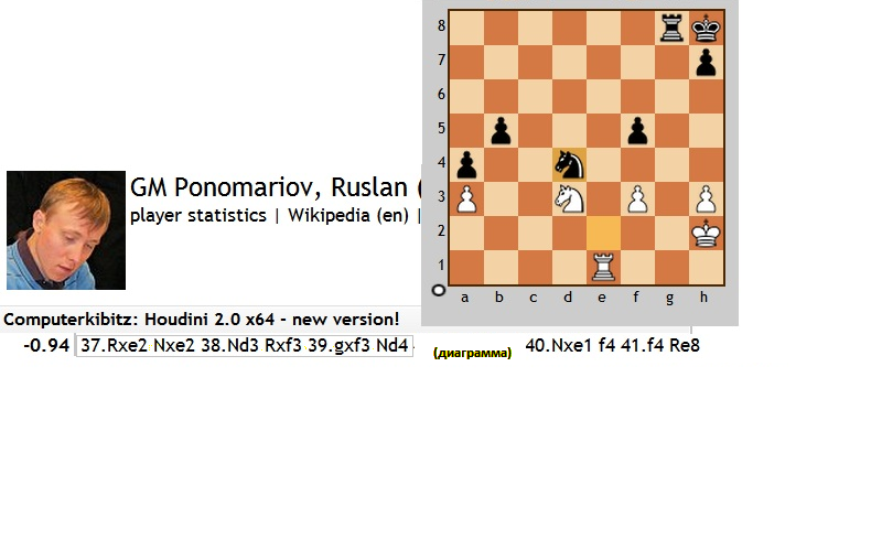 Гудини тоже на стороне Иванчука. 40 ход белых шедевральный (это вариант после 36 хода), как впрочем и ходы на f4 |