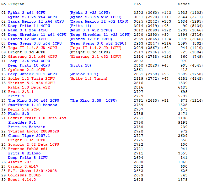 Принципиальный недостаток этого старого и авторитетного рейтинг-листа – в один список они включают движки, протестированные на разных машинах, что вносит большие искажения. Также в этом списке нет, к сожалению, многих сильных движков.