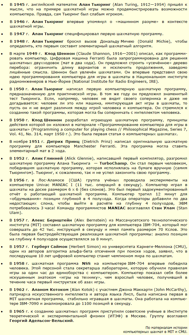“Конечно, мы оба понимаем, что происходит в лаборатории Ботвинника. Он верит, что проблема может быть решена методом траекторий. Он чертит дерево вариантов, чтобы его помощники видели цель, к которой должна стремиться программа. Но возникает вопрос, на который нет ответа: действительно ли его программисты работают? Программисты ли они вообще? Или Ботвиннику вполне достаточно создать решение в мечтах и опубликовать его?” |