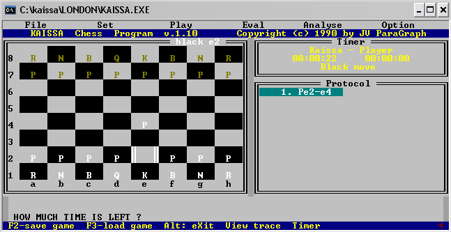 | Каисса существует и в виде IBM PC программы. Я там не совсем с меню разобрался, мышкой фигуры не подвигать, непонятно с уровнями игры, лень честно говоря -- типичная прога конца 80-х. |