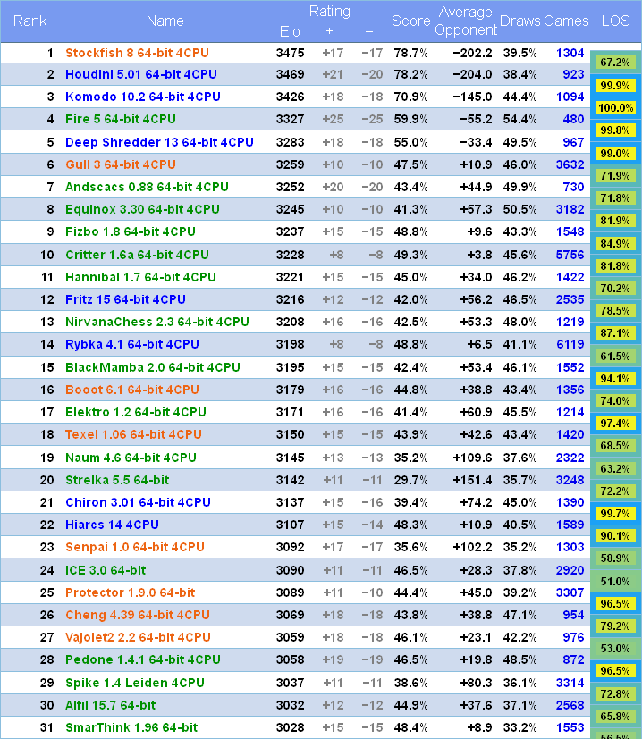 Если привязывать к старому "нормативу" - "Aristarch 4.50 = 2600", к которому традиционно привязываю уже лет 10, то CCRL 40/4 занижен сейчас на 31 пункт, и Stockfish 8 64-bit 4CPU = 3509