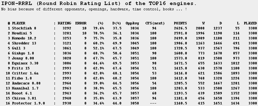 BillyBones: А вот если выставить двадцать пятой по рейтингу программе установки на ничью и играть по дебютной книге, проиграет ли она хотя бы одну партию в матче из 16 Стокфишу? |