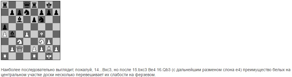 Big_Buddha: RыbkaКАРП: masterd: | Michael_S: Я не понял идею хода 14. .. Bxf3. Компу нравится, значит видимо идея есть, но я ее не понял. | Возможно Владимиру Борисовичу не понравилось, что в других вариантах белые получают фигурный контроль над полем е5. Хотя... на мой взгляд черные ошиблись позже | идея в размене белых фигур контролирующих поле Е5 ,путем С:ф3 и Сb4-Cd6,далее Фе7 и черные проводят е6-е5 |