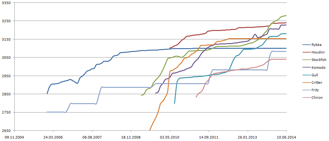 тем не менее, прогресс все время продолжался через рождение новых движков, а если посмотреть на график стокфиша на картинке, то хорошо видно, что стагнация уже была, и сменилась новым бурным ростом