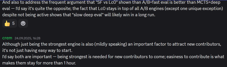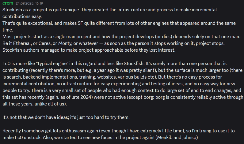 Ну и да, стокфишу проще начать помогать. Написал патч, на фреймворк запулил, он прошёл - ты молодец. У лилы это всё очень кривая и сложная процедура на самом деле.