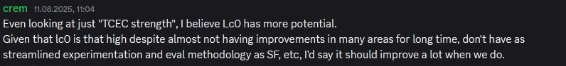 And also to address the frequent argument that "SF vs LcO" shown than A/B+fast eval is better than MCTS+deep eval — I'd say it's quite the opposite; the fact that LcO stays in top of all A/B engines (except one unique exception) despite not being active shows that "slow deep eval" will likely win in a long run.