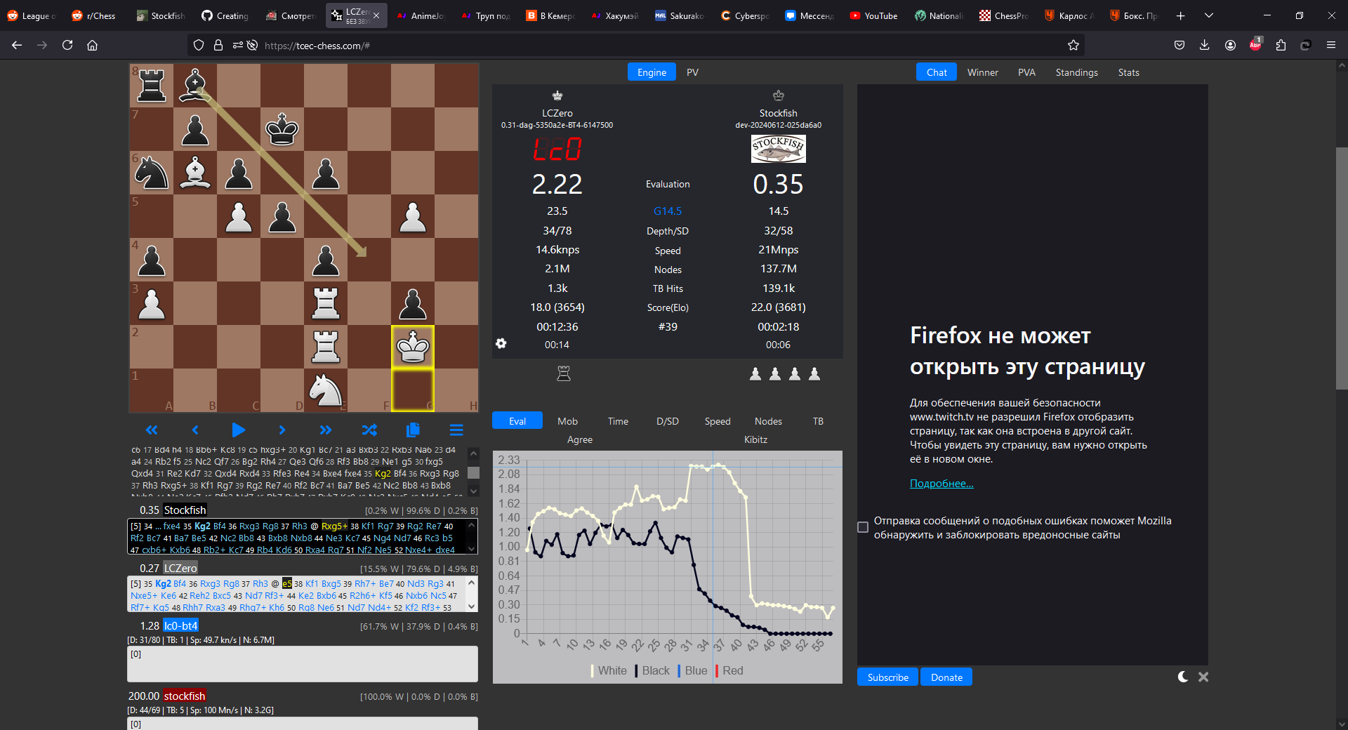 Evgeny Gleizerov: Идея довольно понятна. Лила не закрывала королевский фланг (что легко могла сделать), чтобы не дать Стокфишу перебросить все силы на ферзевый и провести a4-a5. Но тогда Стокфиш перебросил их на королевский и вскрыл игру там. Классическая игра на две слабости, базирующаяся на огромный перевес в пространстве. Конечно, это легко сказать, но трудно сделать, но, во всяком случае, ничего потустороннего в игре белых не вижу.
