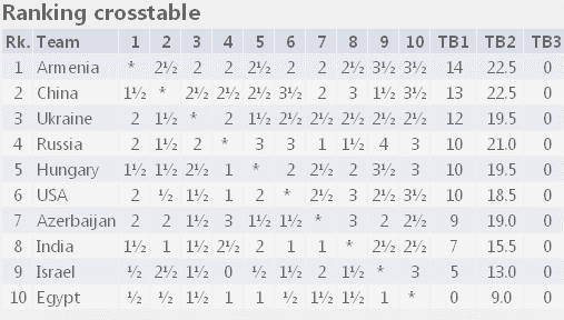 Грустно. Украина и Китай, игравшие очень посредственно, взяли медали. Россия не выдержала постоянных тренерских установок. Армения показывает не столько класс, сколько на что способна команда, не лучше других, в которой просто нет внутренних проблем. Большего, как показывает история, совершенно не нужно. Не мешающий тренер, четкая иерархия между досками. И все! Когда в РШФ это поймут уже наконец, просто обидно все это видеть...