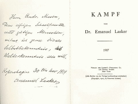 Казалось, что творческий дух создает шахматные идеи из ничего. Морфи выигрывал как белыми, так и черными. Почему? Потому, что у него были блестящие идеи; противник же их не имел. Морфи был гений, полубог. По крайней мере, так казалось. Однако, пришло новое время, когда один маэстро познал, что факты и комбинации подчиняются логическим законам, законам особого рода (sui generis), имеющим мало сходства с естество-научными или психологическими законами, устанавливающими награду и наказание. Имя этого человека — Вильгельм Стейниц. Правда, Стейниц выразил эту мысль лишь неполно и отрывочно; однако его работа протекала как раз в этом направлении. В настоящее же время существует теория шахмат, которая, как мне кажется, имеет право претендовать на создание новой точки зрения. Эта точка зрения не только нова; она также весьма плодотворна для всех видов борьбы вообще.