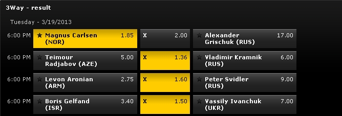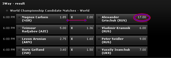 Впервые вижу, чтобы в шахматах (где ставки принимаются на более-менее равные поединки) на победу любого из соперников ставки были ниже, чем на ничью. И ставка на победу Грищука до странности велика.