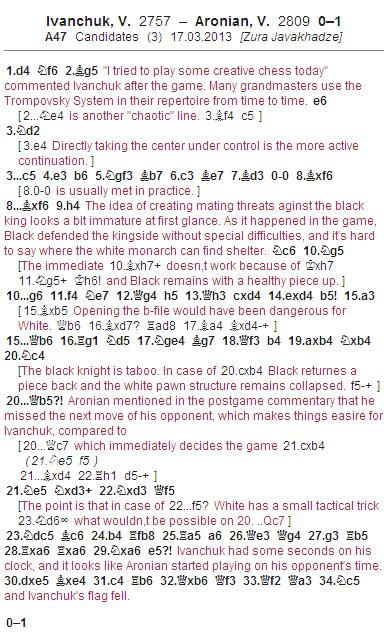 "На обязательной для игроков пресс-конференции я спросил у Ароняна: отчего его игра напоминала американские горки? И Левон чистосердечно признался: увидев, что у соперника на часах остались считаные секунды, играл уже "на время". И добавил, что не считает это чем-то зазорным..."