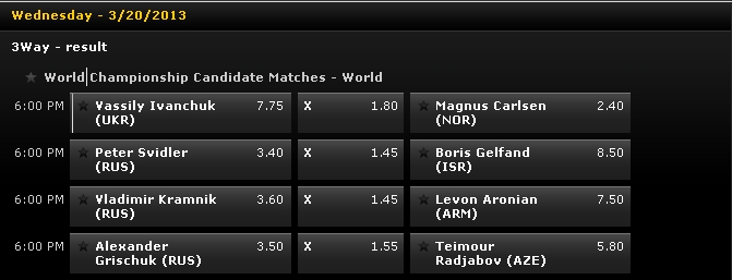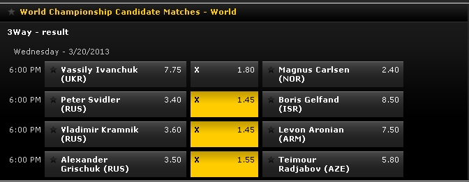 А вот рекомендованные ставки. Как видно, на партию Иванчук-Карлсен подсказок нет. )
