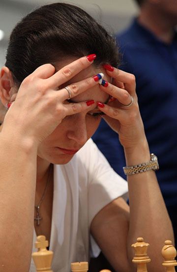 Отличное фото с сайта chessbase, подпись под ним Alexandra Kosteniuk with her trademark ring fingernails with the colours of the Russian flag.