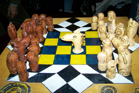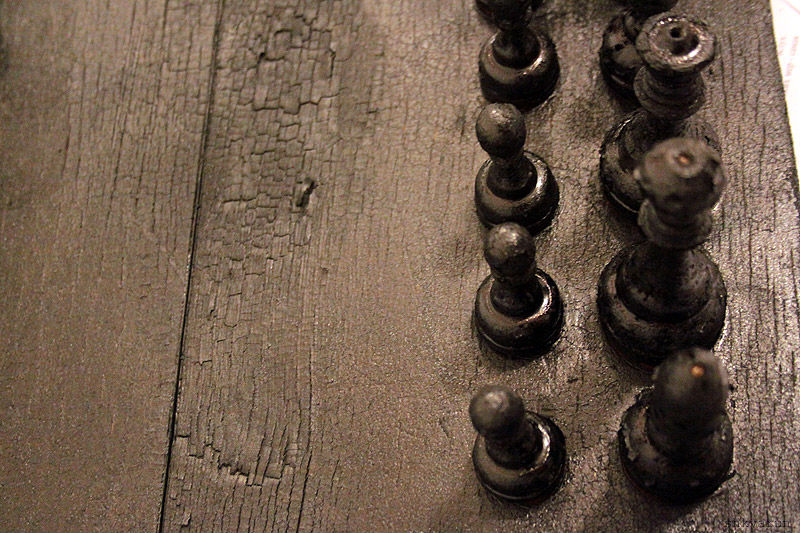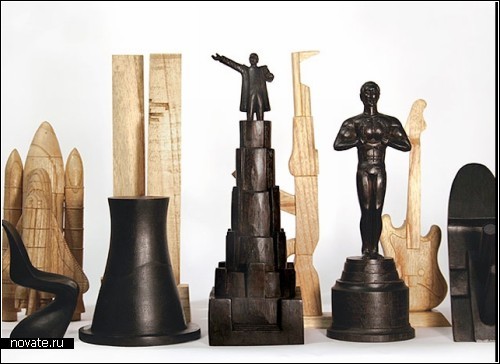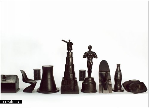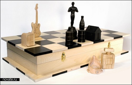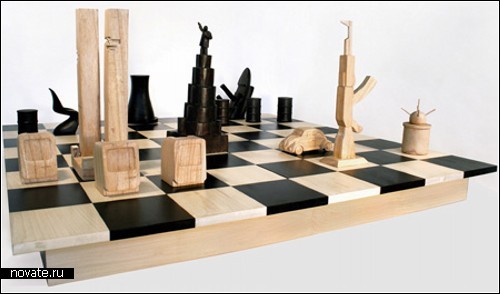 Вырезанные из дерева фигурки называются History Chess - исторические шахматы, причем каждая фигурка - это один из эпизодов XXI века. Так, здесь можно отыскать фигурки Титаника и печально известных башен-близнецов, мини-модель Чернобыльской АЭС и памятник Ленину, бутылку Coca-Cola и гитару времен The Beatles... Здесь даже есть крохотные деревянные фигурки "горбатого" "Запорожца" и космического "Шаттла"! Что и говорить, - никто не забыт, ничто не забыто...