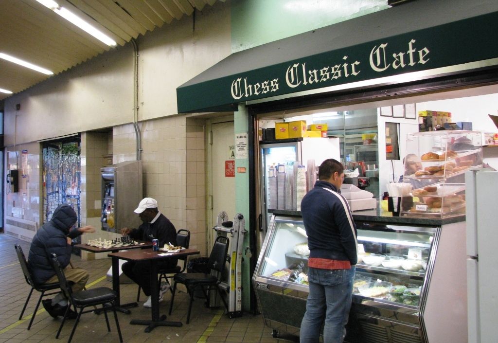 | But adding an extra layer of weirdness to it all is the singular Chess Classic Cafe. This is just a little, hole-in-the-wall deli. Nothing special about it. Except it's got that grandiose name. And you can play chess there. There are a couple small table and chair set-ups outside the cafe, which are routinely filled with men bent over their chess games. Anyone can play there. And it doesn't look like you have to buy a lot to do so. |
