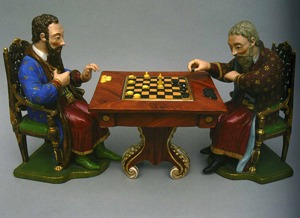 Чернильный прибор в виде двух мужчин в древнерусских костюмах (царя и барина), играющих в шахматы, сидя за столом.