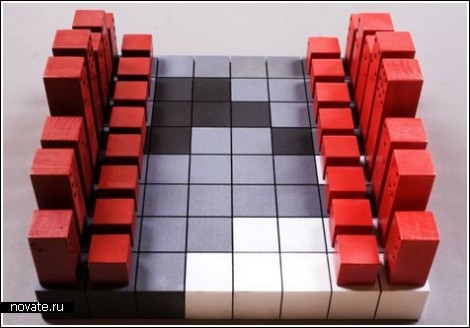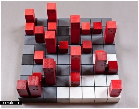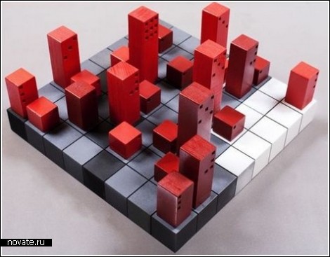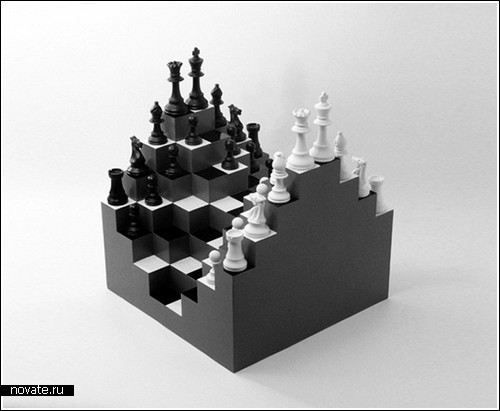 Несколько раз мы уже упоминали о шахматах, нами был представлен целый список самых любопытных шахмат. Однако, в том списке все шахматы были стандартными – да, они выполнены в виде разных героев, фигурки очень симпатичные и интересные, но вот доска кроме цвета и рисунков на ней не претерпела никаких изменений. Дизайнер Ji Lee посчитал, что видоизменять нужно как раз доску, а не фигурки. И в итоге мы видим, что он пришел к очень неожиданному решению – предложил сделать шахматы трехмерными! Что ж, идею стоит признать крайне любопытной, ведь доселе мы нигде не могли встретить чего-то подобного. Но однозначно назвать проект удачным язык не поворачивается, ведь шахматы, как мне кажется, не совсем удобны с практической точки зрения – да, они красивые, привлекающие внимание, но не совсем пригодные для игры.