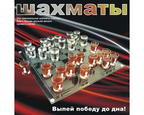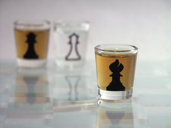 Обычные шахматы, но вместо фигур – стопки. Игра приобретает особый смысл, игроки делаются азартнее. Еще бы! Ведь теперь вместо того, чтобы банально забирать и складывать в сторонке «убитые» фигуры противника, можно выпивать их содержимое. Правда в классической шахматной игре появляется один дополнительный нюанс: неизвестно, кто будет чаще выигрывать – тот, кто лучше разбирается в шахматах, или тот, кто меньше пьянеет.