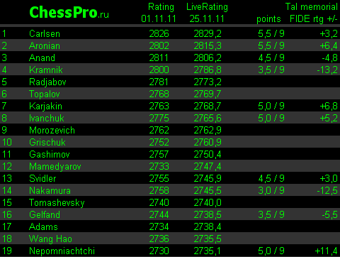 А ещё подтвердил,что такого уж большого отрыва первой тройки от остальных,о котором часто говорят,нет.Эмиль говорил,даже,о четвёрке.Но Крамник,на мой взгляд,так высоко уже не котируется...