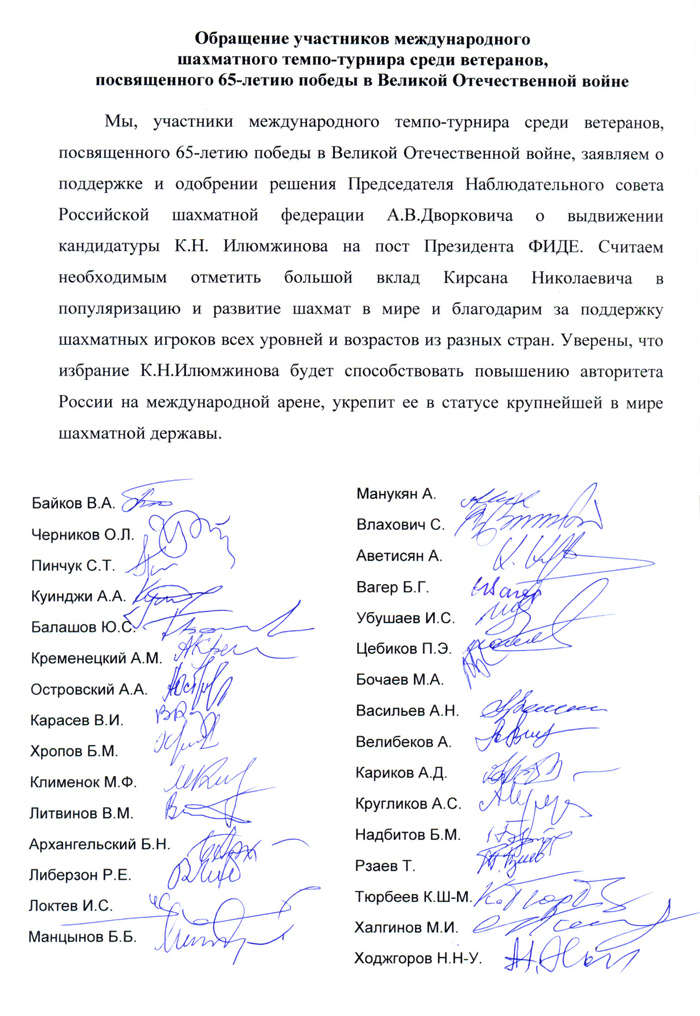 Обращение участников международного шахматного темпо-турнира среди ветеранов, посвященного 65-летию победы в Великой Отечественной войне