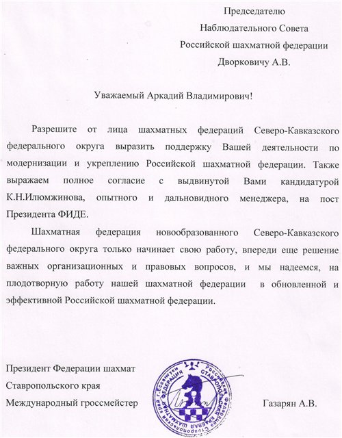 Обращение Северо-Кавказского ФО к Председателю НС РШФ Дворковичу А.В.(24.05.2010г., сайт Федерации шахмат Калмыкии)