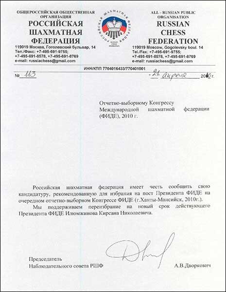 РШФ в случае выполнения этих требований поддержит кандидатуру Илюмжинова на предстоящих выборах и будет способствовать выполнению этих планов. - сказал председатель Попечительского совета РШФ Аркадий Дворкович.