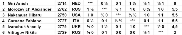 Состав: Василий Иванчук (Украина, 2775), Александр Морозевич (Россия, 2762), Хикару Накамура (США, 2758), Никита Витюгов (Россия, 2729), Фабиано Каруана (Италия, 2727), Аниш Гири (Нидерланды, 2714).