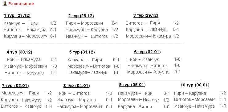 | По ощущениям турнир как будто проходил в быстрые шахматы! ) Михалыч выиграл даже с форой - позволил Хикару с темпом развить короля на д8 ) |