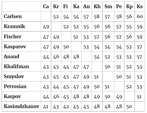 The current world champion, Magnus Carlsen, tops the list, while Bobby Fischer is third. Here are predictions of game results between the different world champions in their best year: